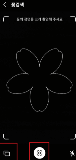촬영 카메라 권한을 허용한 후, 카메라가 실행되면 꽃 사진을 찍거나, 우측하단에 있는 갤러리 아이콘을 눌러서 갤러리에 있는 꽃 사진을 선택합니다.