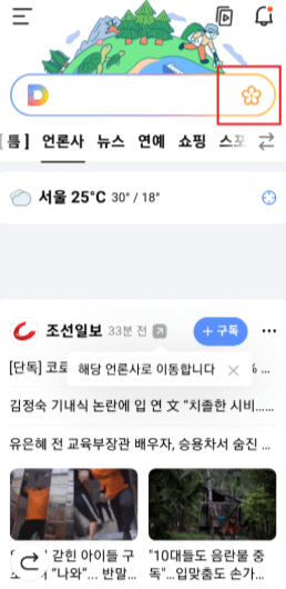 다음 어플에서 사진으로 꽃 이름 찾기 방법에 대해 알아보겠습니다. 우선, 다음 어플부터 다운로드 받습니다. 다음 어플을 실행한 다음, 상단 검색창 우측에 있는 아이콘을 눌러줍니다.