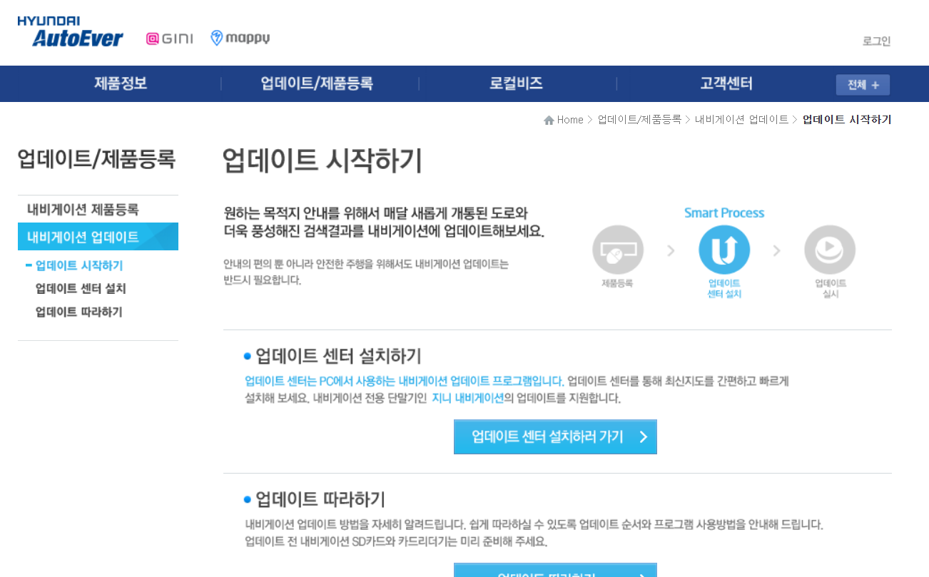 업데이트를 하기 전에 여러분이 갖고 있는 네비게이션 기기를 먼저 등록해야 합니다. 기기 등록 방법은 업데이트/제품등록 - 내비게이션 제품등록 메뉴를 차례대로 클릭하면 됩니다. 여기에서 현대오토에버 계정 정보가 필요한데 회원가입을 한 후 계정 정보를 이용하여 기기 등록을 할 수 있습니다.